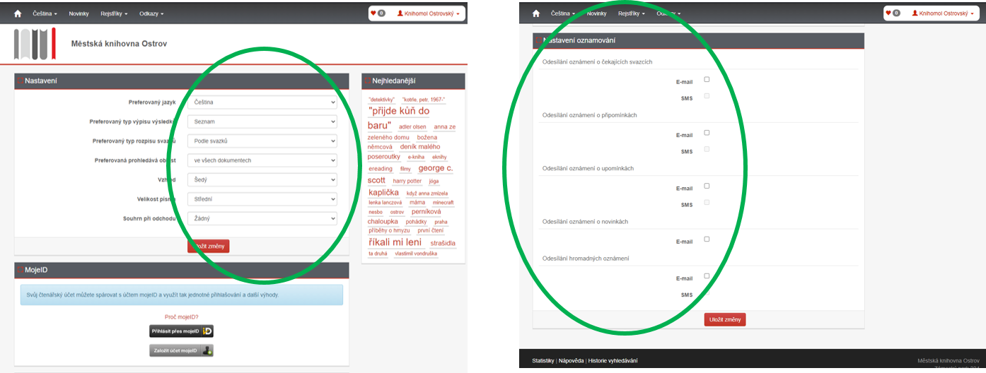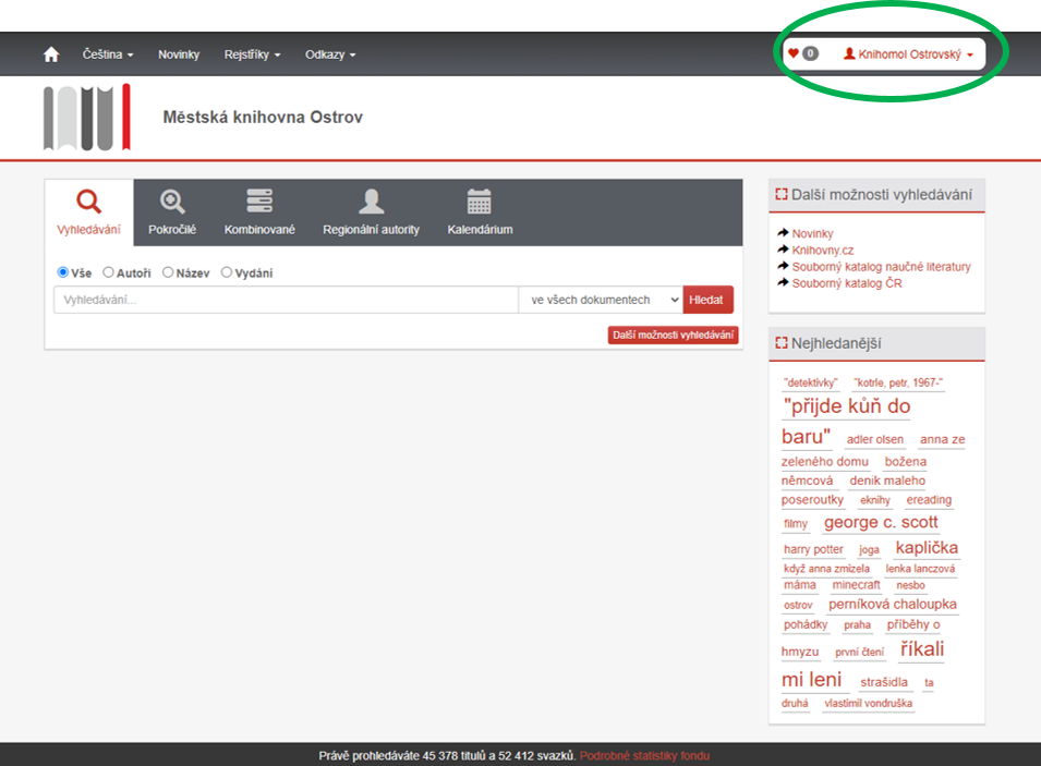 4. Kliknutím na malou šipku vedle svého jména se vám rozbalí nabídka – NASTAVENÍ, ZMĚNA HESLA, OSOBNÍ ÚDAJE, MOJE VÝPŮJČKY, MOJE OBJEDNÁVKY, MOJE POPLATKY, ZÍSKÁNÍ OSOBNÍCH ÚDAJŮ a možnost ODHLÁSIT.