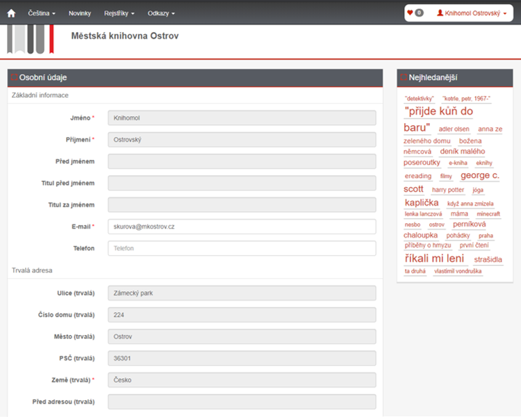 7. Klinutím na OSOBNÍ ÚDAJE se dostanete na formulář, kde můžete přidat kontaktní adresu. Nezapomeňte však tyto změny nahlásit také v knihovně, je třeba doplnit vše do přihlášky.