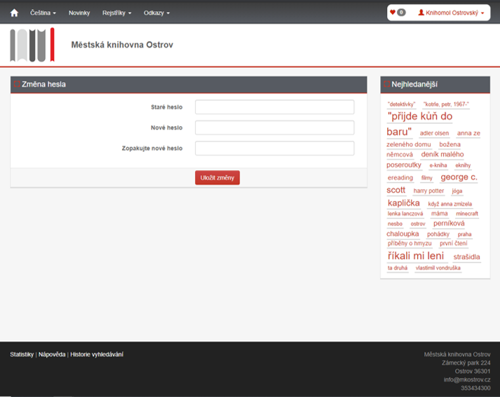 6. Klinutím na ZMĚNA HESLA se dostanete na formulář, kde můžete změnit heslo pro přihlášení do on-line katalogu (čtenářského konta). Nezapomeňte si však nové heslo poznamenat!