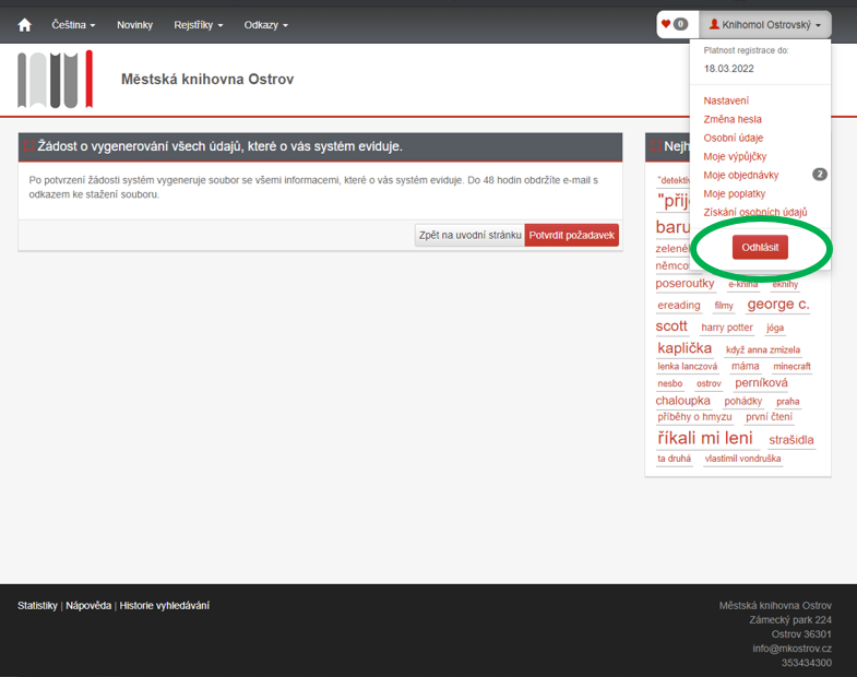 12. Zbývá již poslední možnost ODHLÁSIT se ze svého čtenářského konta. Tuto možnost využijte pokaždé, když ukončíte práci v on-line katalogu.